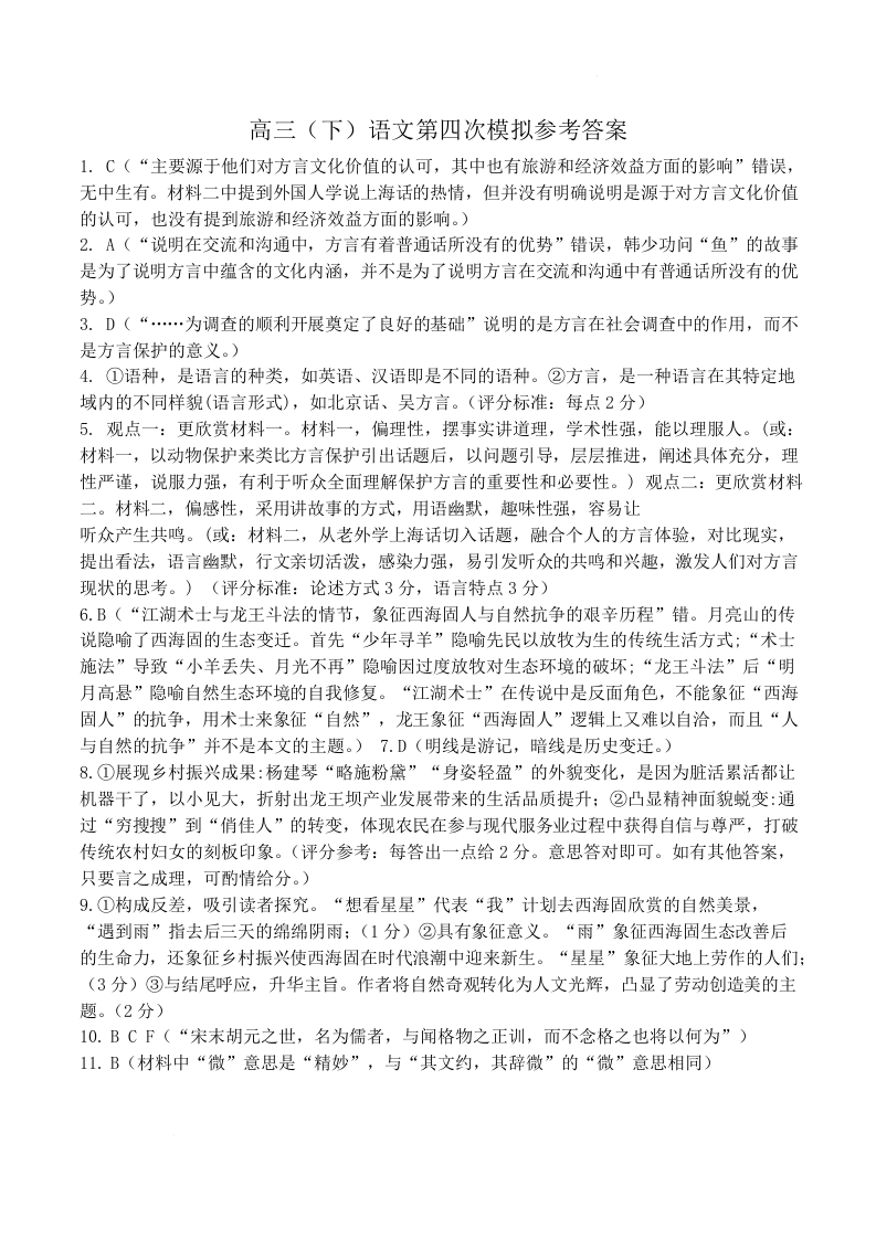 河南省实验中学2025届高三下学期第四次模拟考试语文答案