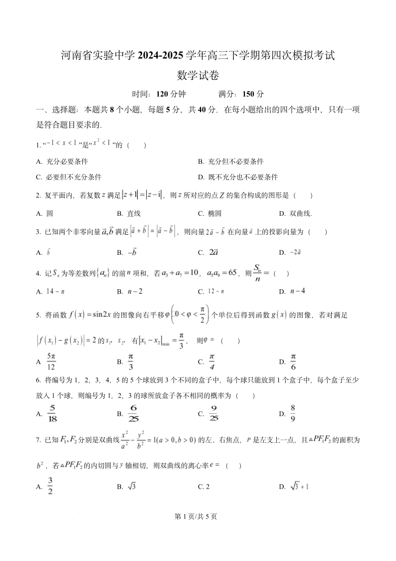 河南省实验中学2025届高三下学期第四次模拟考试数学(原卷版)