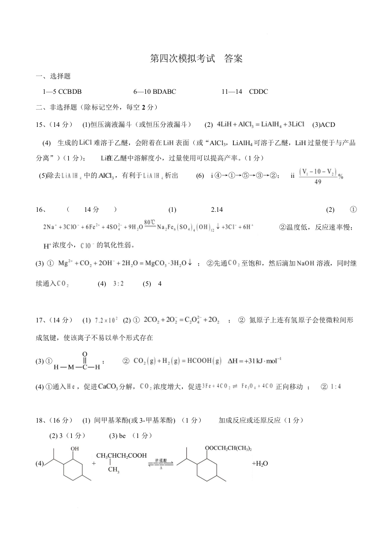 河南省实验中学2025届高三下学期第四次模拟考试化学答案