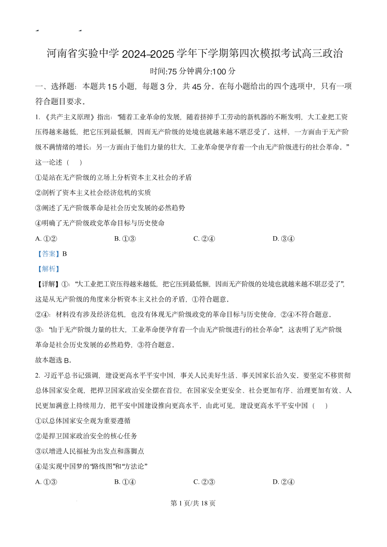 河南省实验中学2025届高三下学期第四次模拟考试政治(精品解析版)