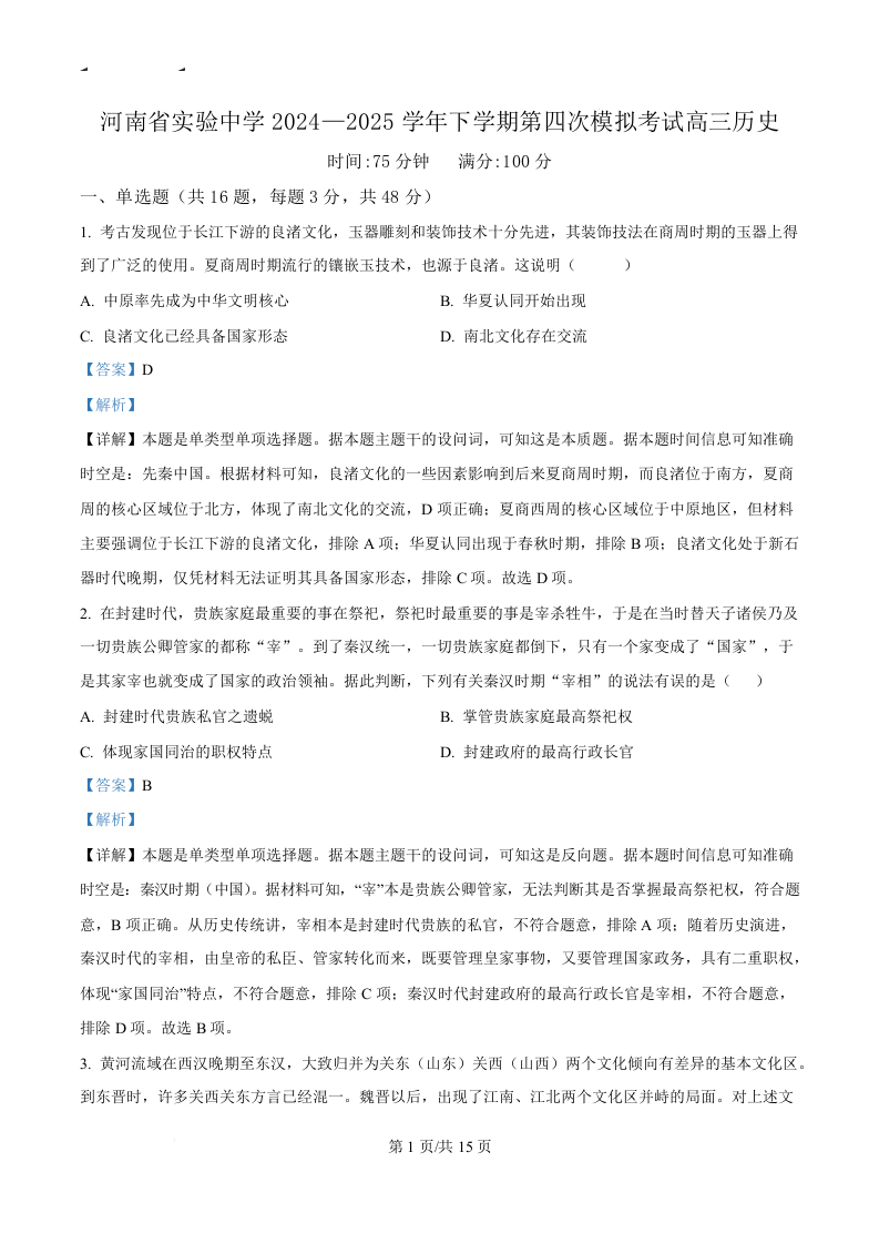 河南省实验中学2025届高三下学期第四次模拟考试历史(精品解析版)
