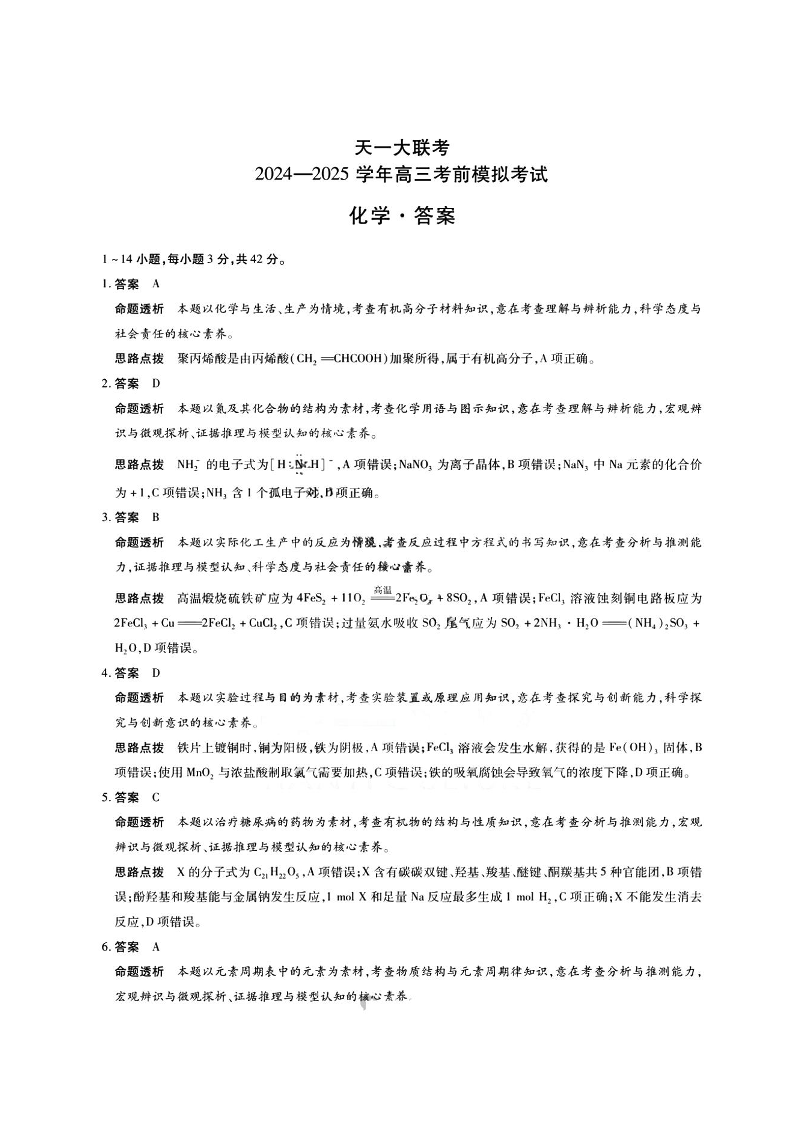 河南省天一大联考2025届高三考前模拟预测化学答案