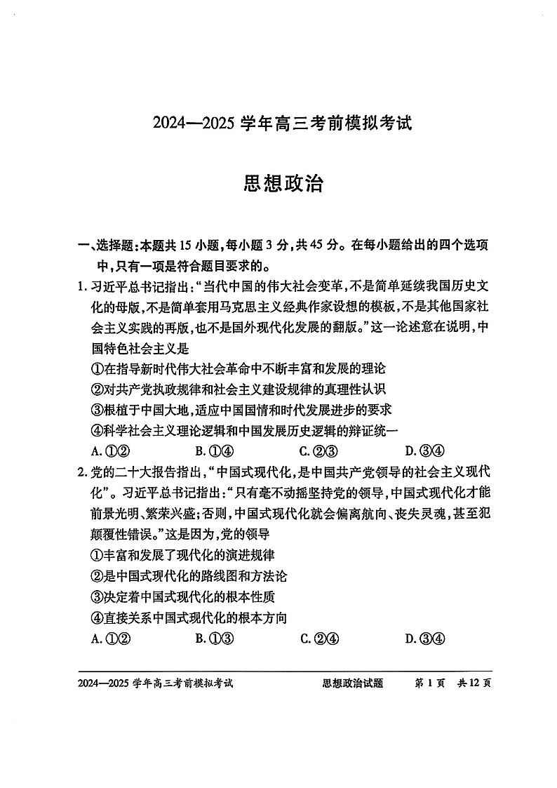 河南省天一大联考2025届高三考前模拟预测政治