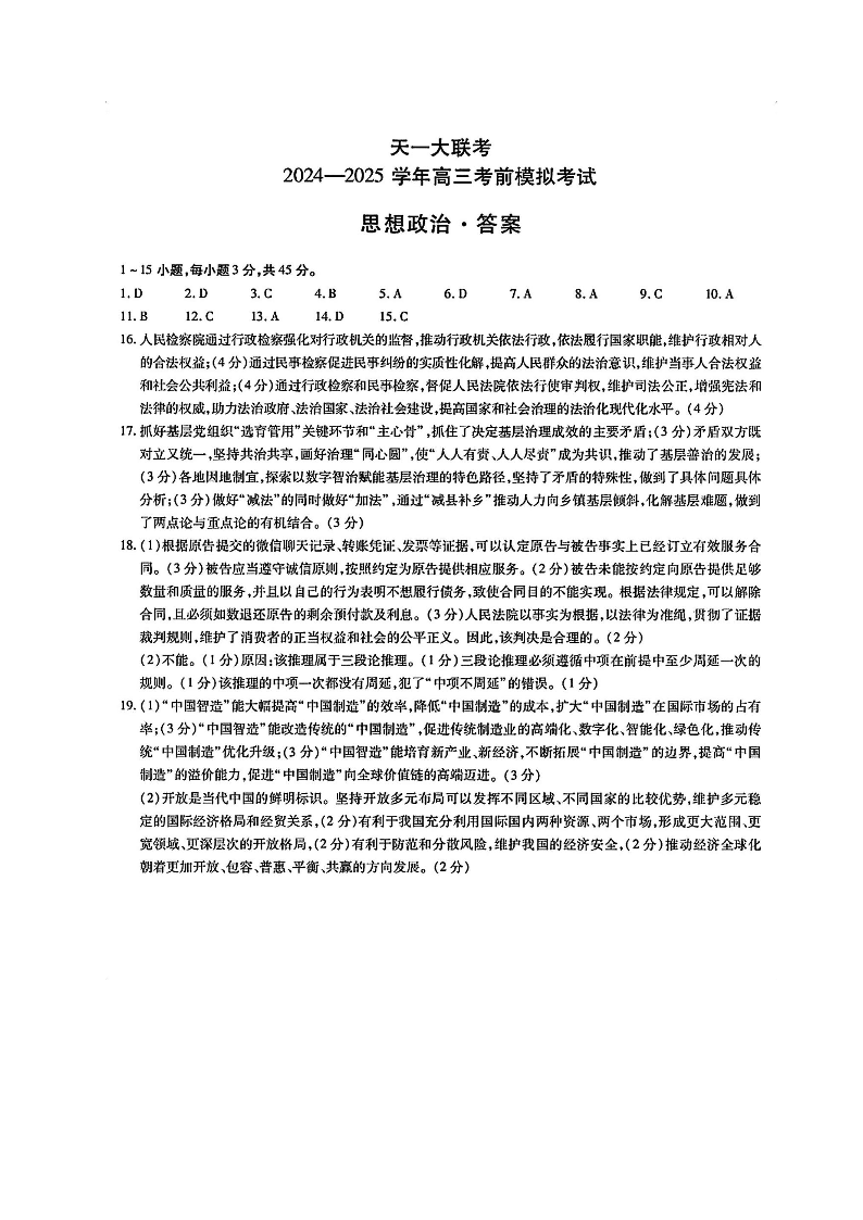 河南省天一大联考2025届高三考前模拟预测政治答案