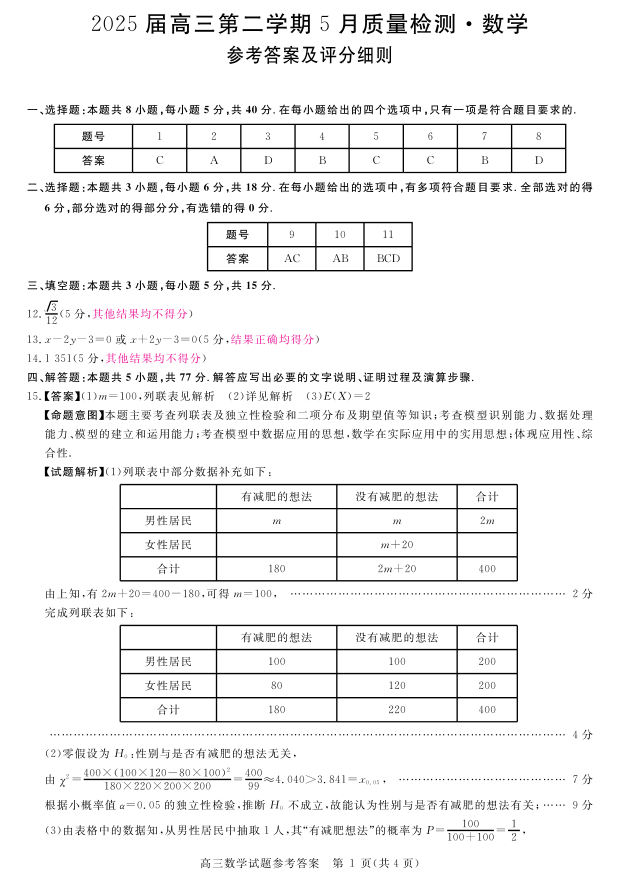 安徽省华师联盟2025届高三第二学期5月质量检测数学评分细则