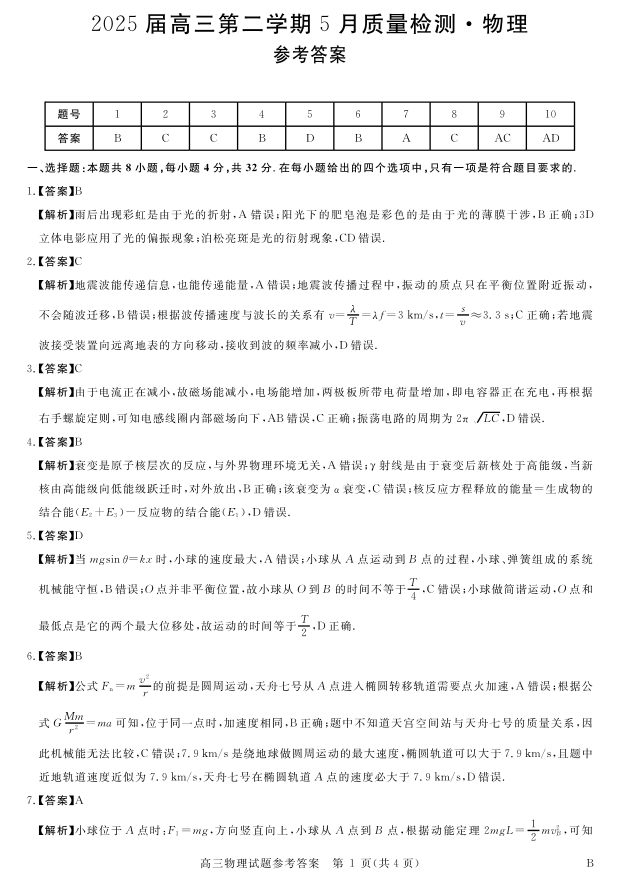 安徽省华师联盟2025届高三第二学期5月质量检测物理答案