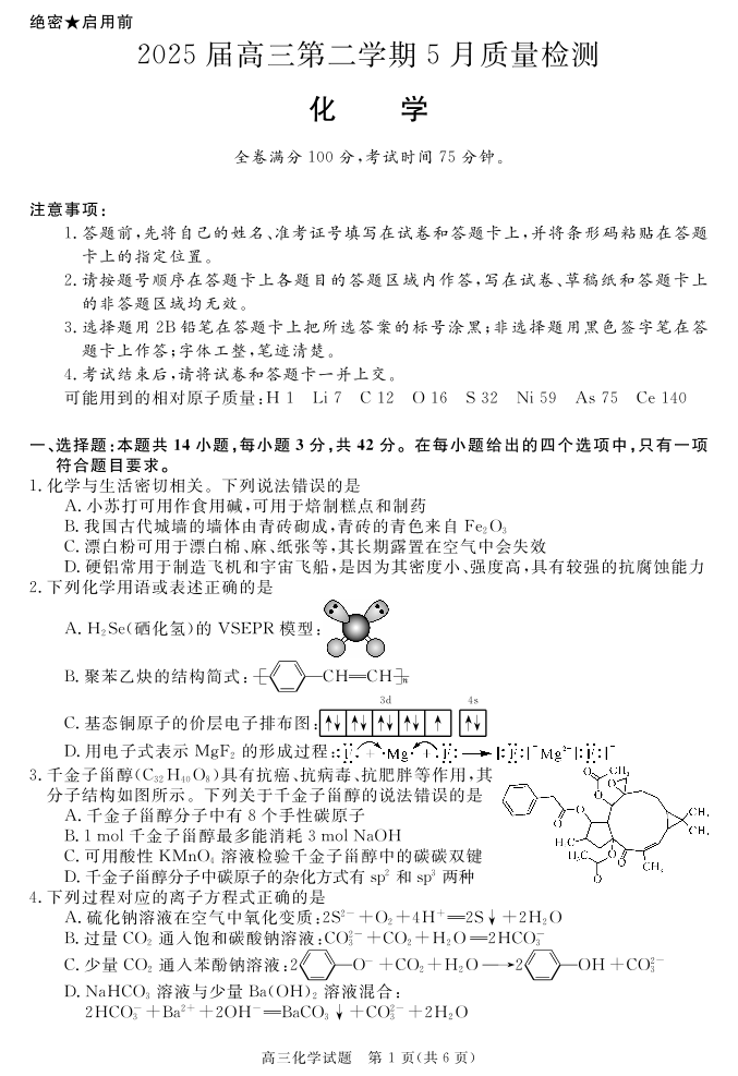 安徽省华师联盟2025届高三第二学期5月质量检测化学