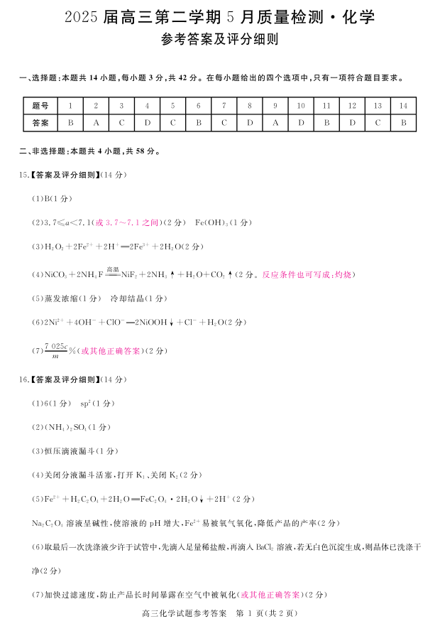 安徽省华师联盟2025届高三第二学期5月质量检测化学评分细则