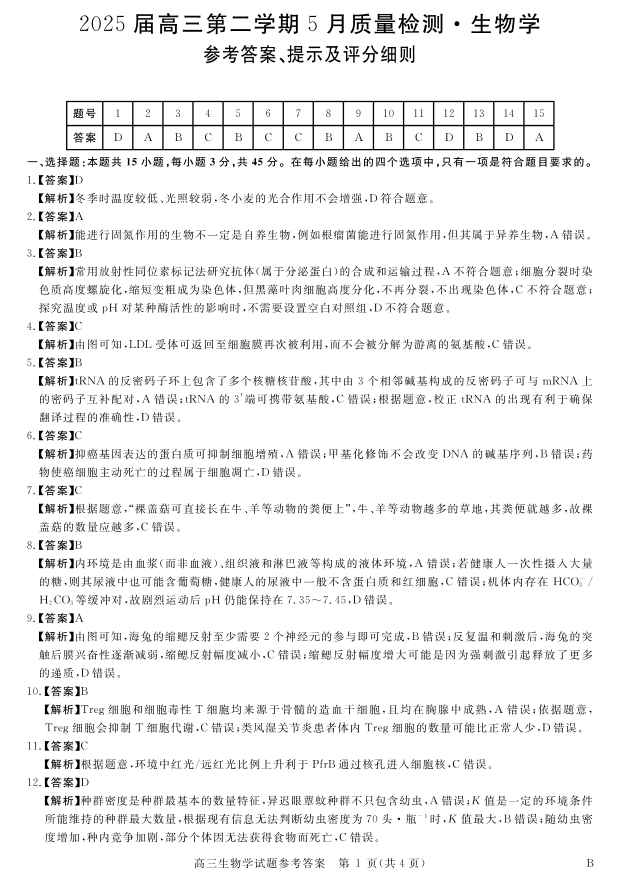 安徽省华师联盟2025届高三第二学期5月质量检测生物答案