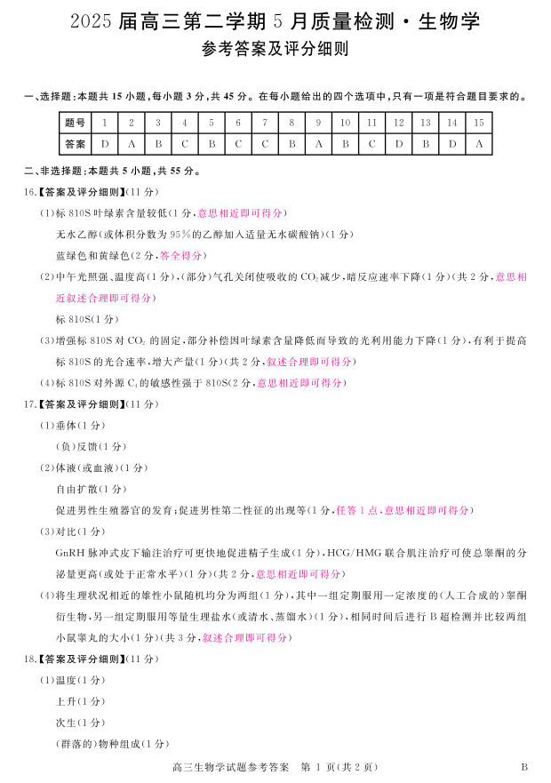 安徽省华师联盟2025届高三第二学期5月质量检测生物评分细则