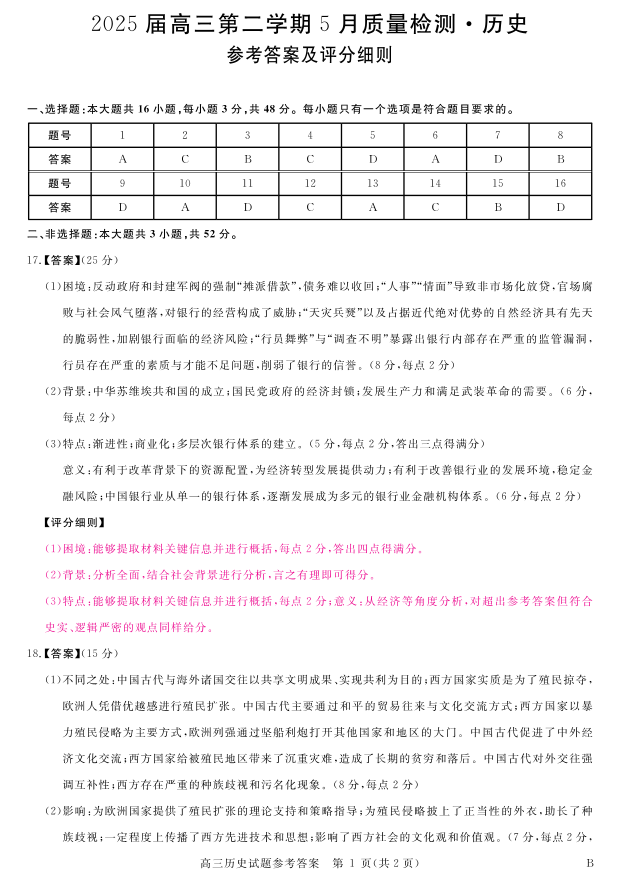 安徽省华师联盟2025届高三第二学期5月质量检测历史评分细则