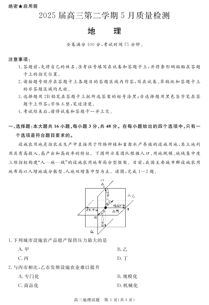 安徽省华师联盟2025届高三第二学期5月质量检测地理