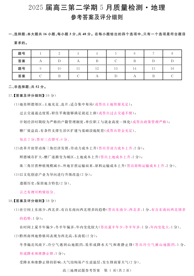安徽省华师联盟2025届高三第二学期5月质量检测地理评分细则