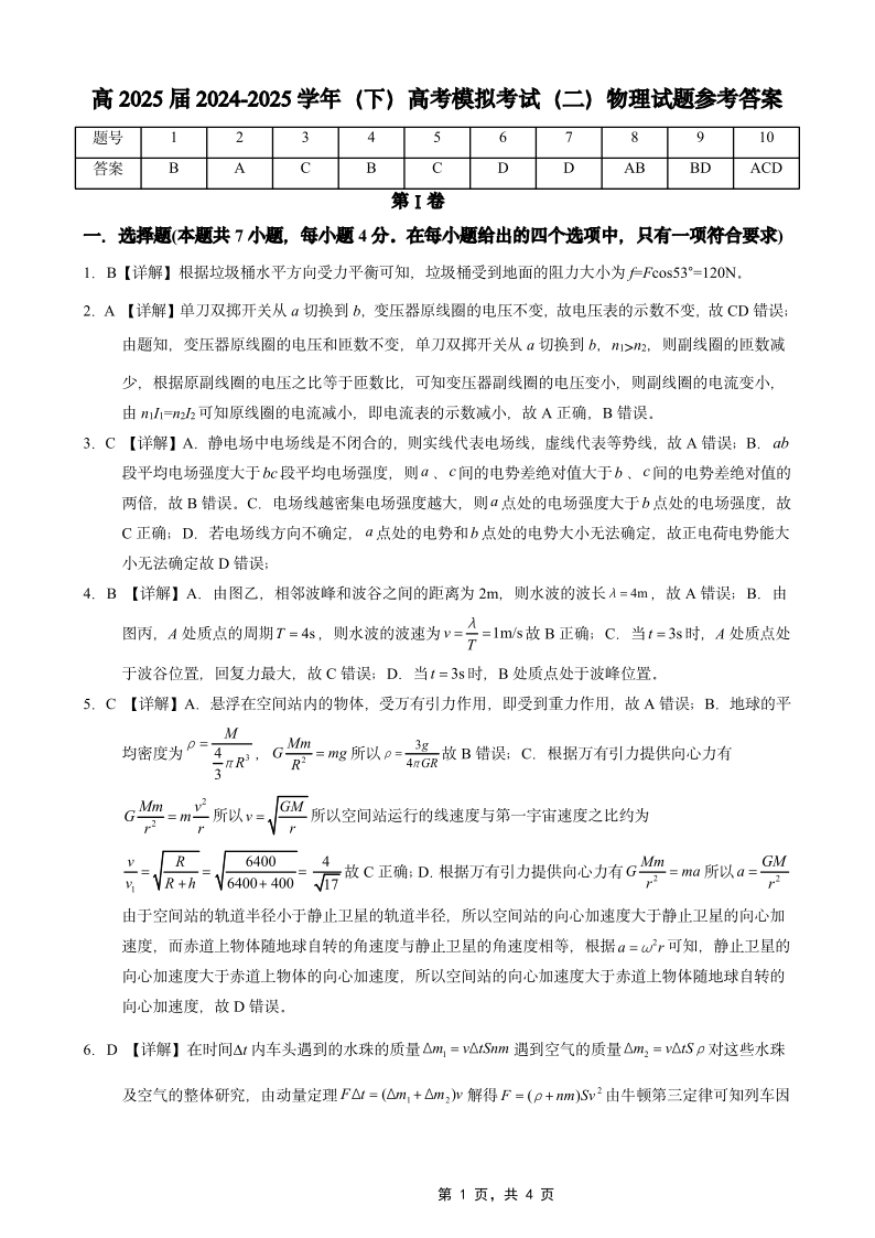 重庆市育才中学2025届高考模拟试题(二)物理答案