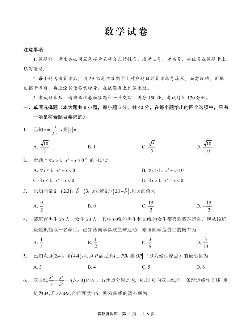 重庆巴蜀中学2025届高考适应性卷(九)数学