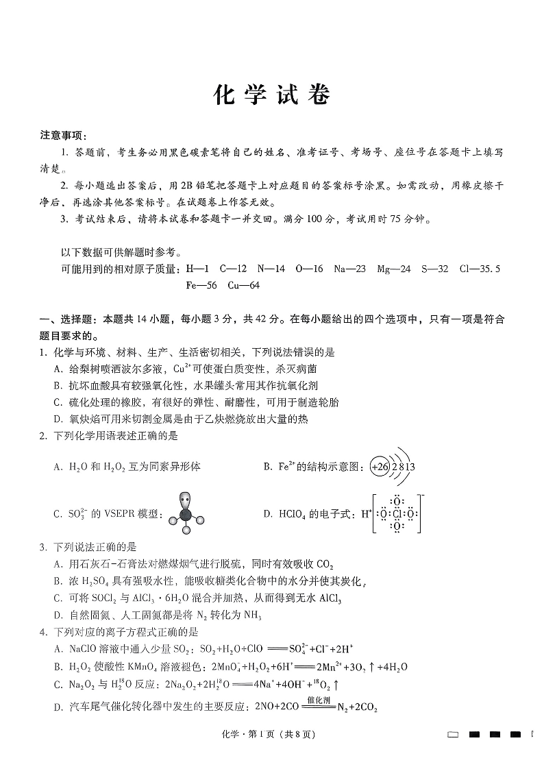 重庆巴蜀中学2025届高考适应性卷(九)化学