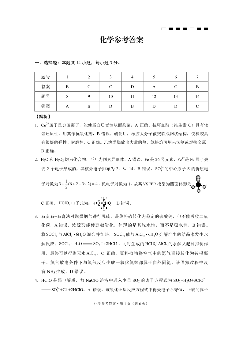 重庆巴蜀中学2025届高考适应性卷(九)化学答案