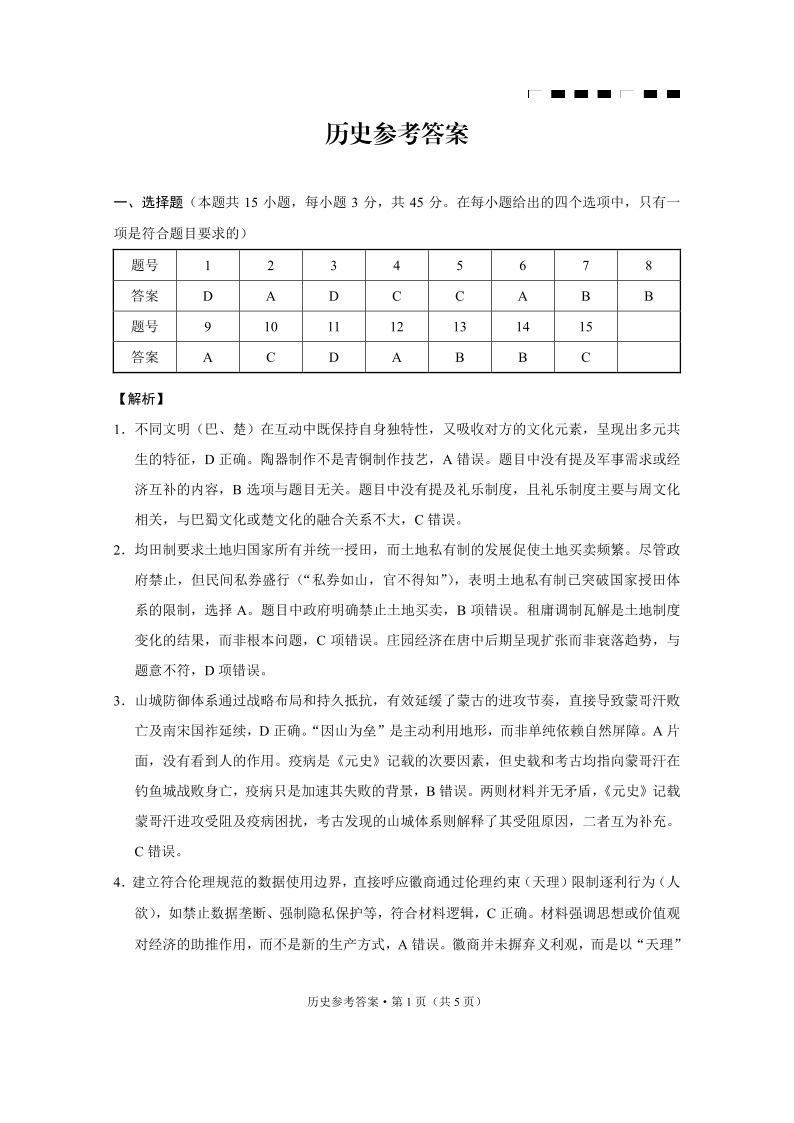 重庆巴蜀中学2025届高考适应性卷(九)历史答案
