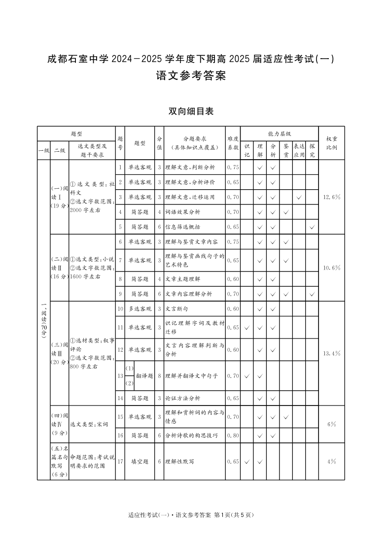 四川省成都石室中学高2025届适应性考试(一)语文答案