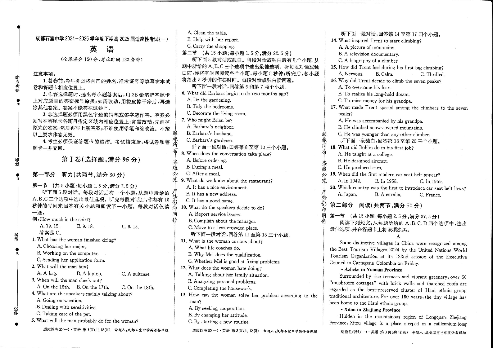 四川省成都石室中学高2025届适应性考试(一)英语