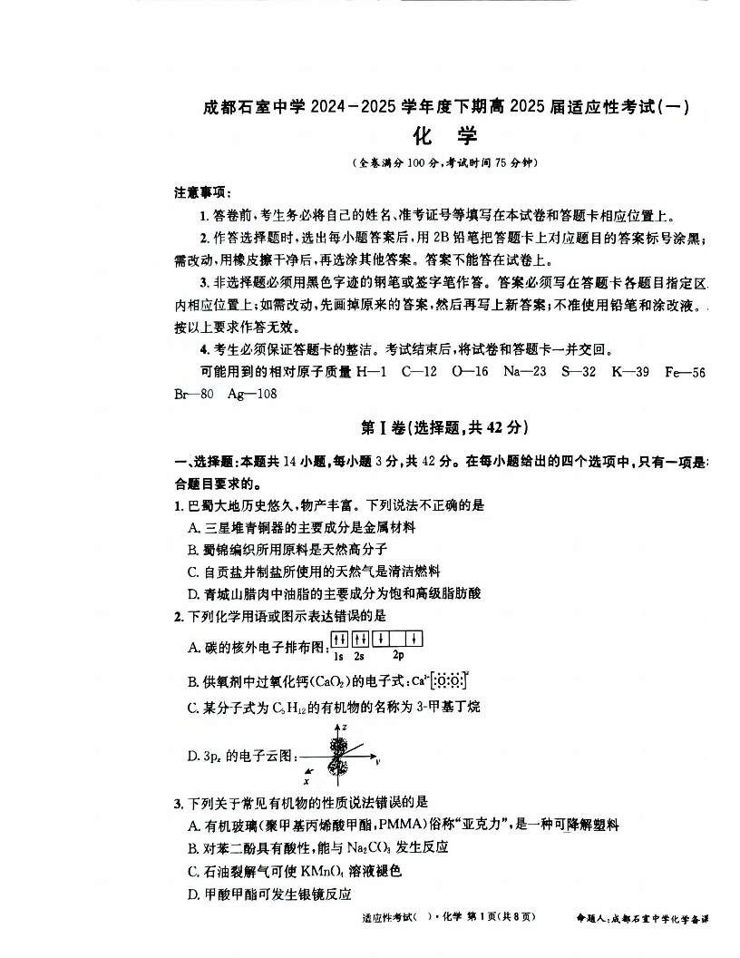 四川省成都石室中学高2025届适应性考试(一)化学