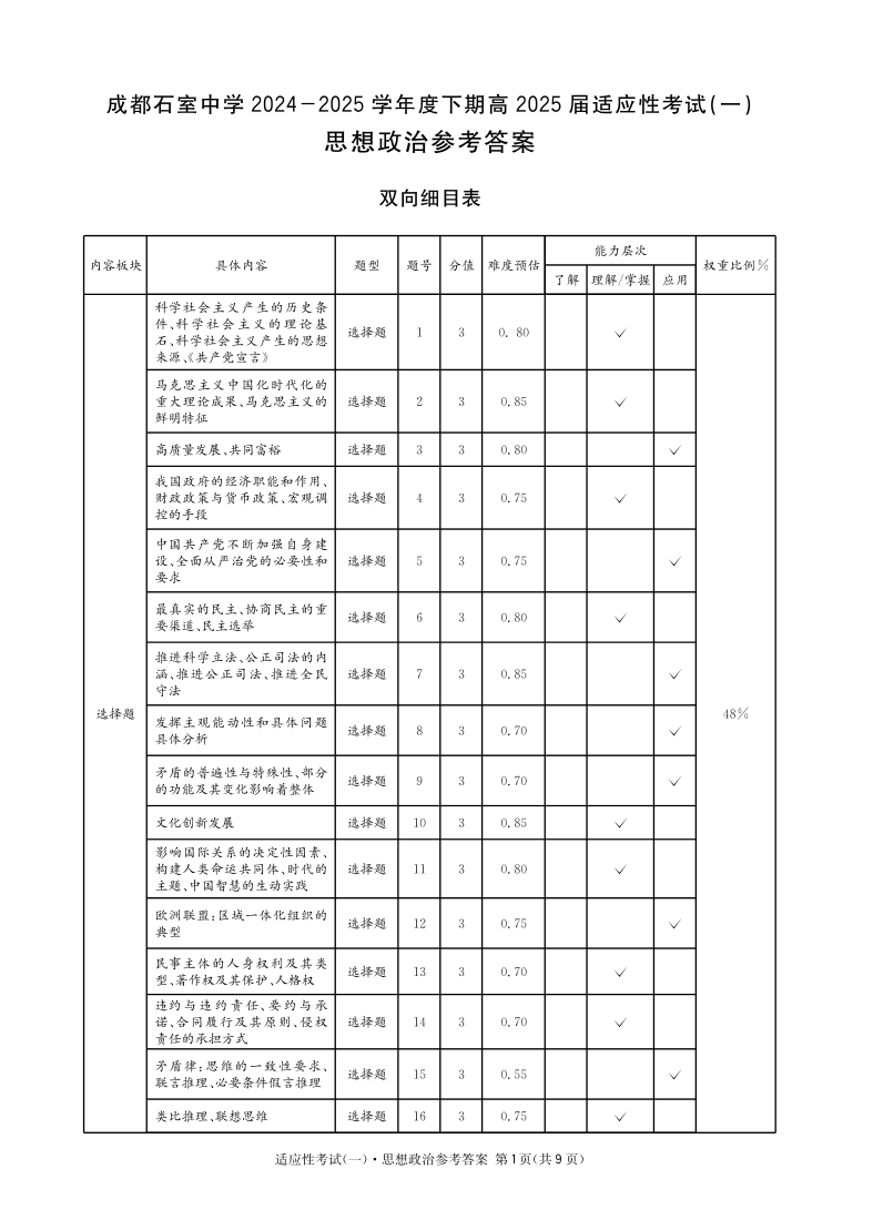 四川省成都石室中学高2025届适应性考试(一)政治答案