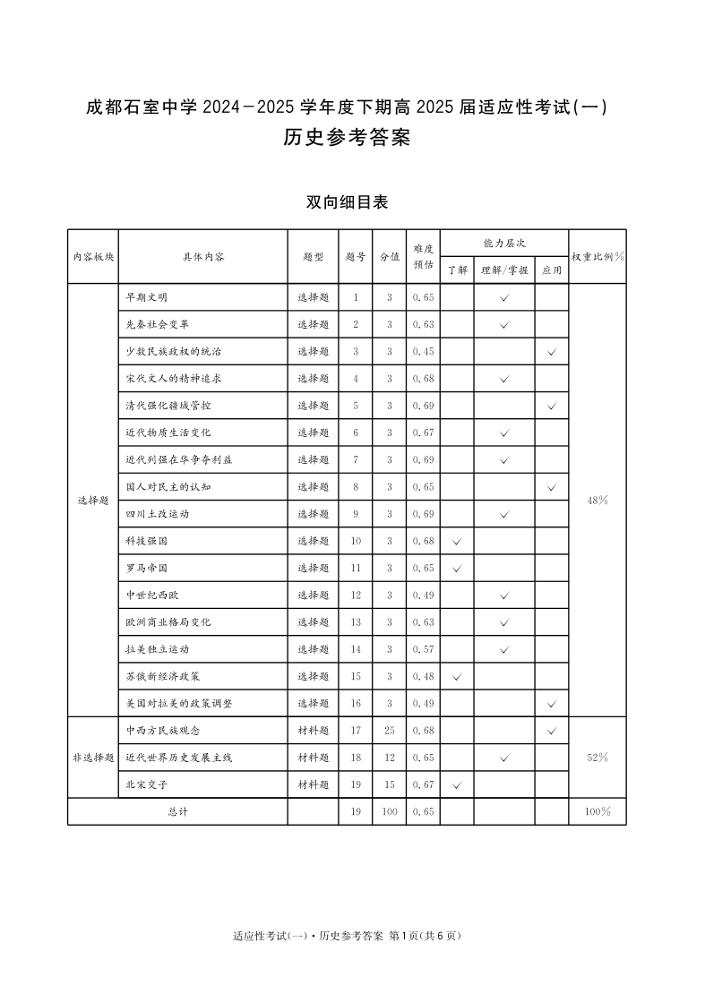 四川省成都石室中学高2025届适应性考试(一) 历史答案