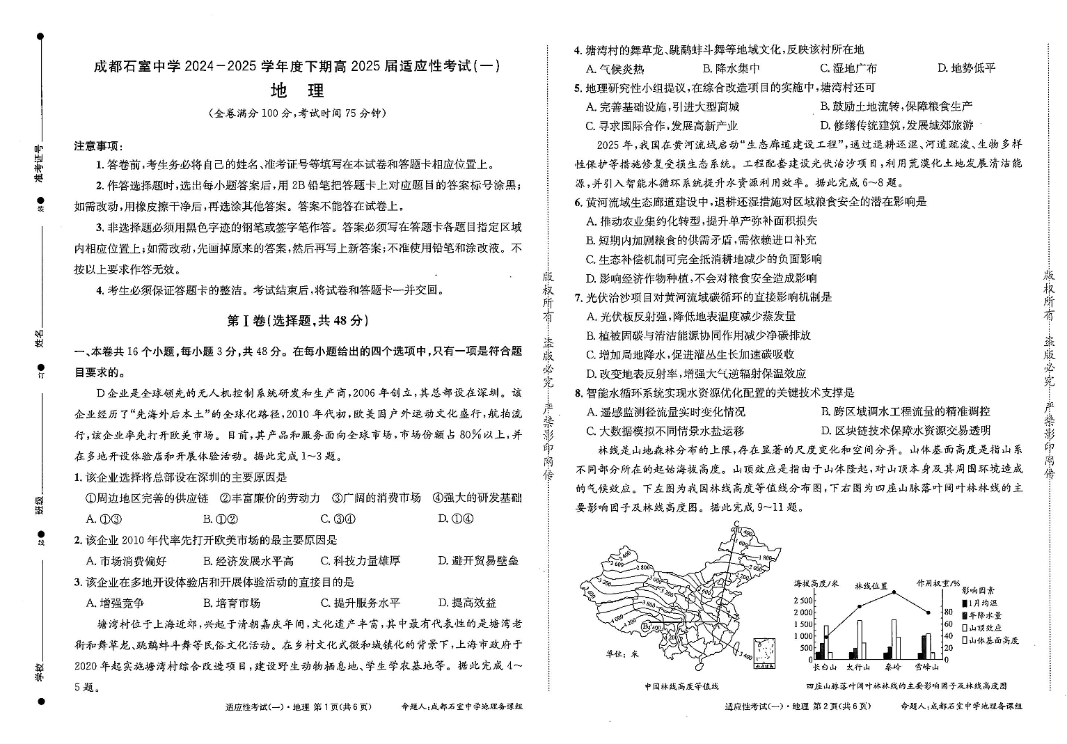 四川省成都石室中学高2025届适应性考试(一) 地理