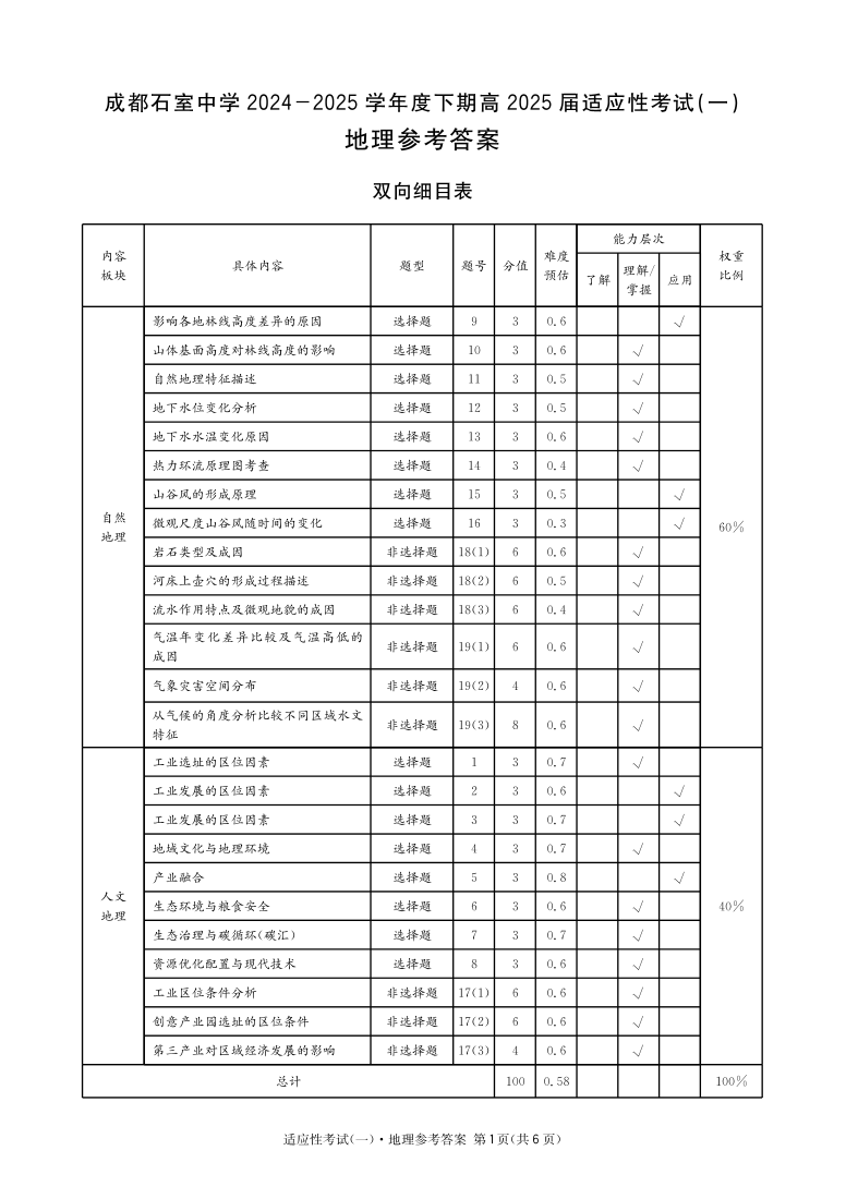 四川省成都石室中学高2025届适应性考试(一) 地理答案
