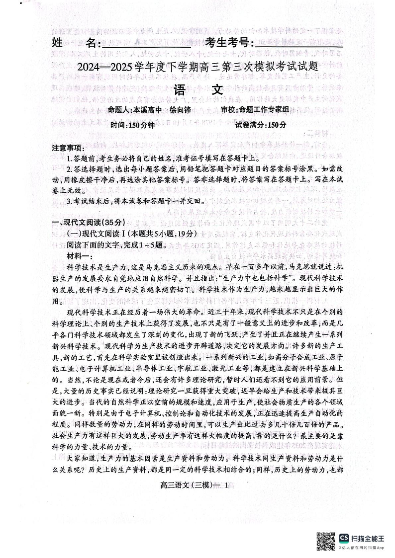 辽宁省辽南协作体2025届高三下学期第三次模拟语文