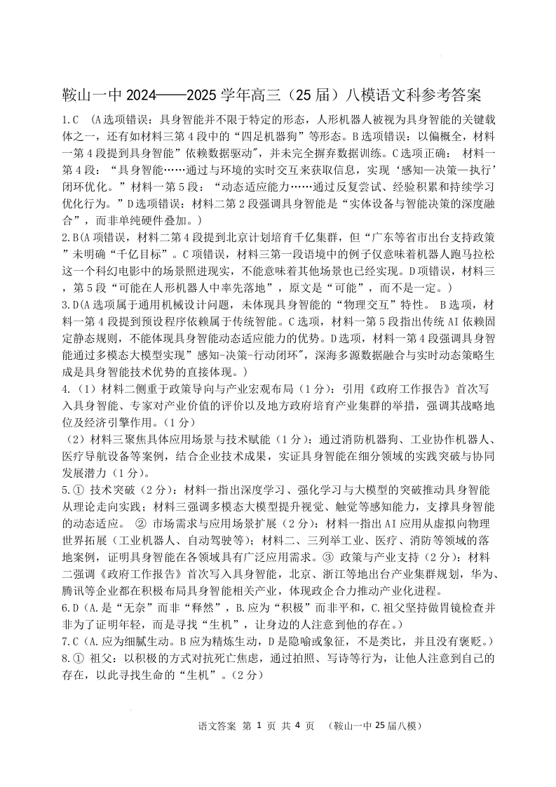 辽宁省鞍山市第一中学2025届高三下学期八模考试语文答案