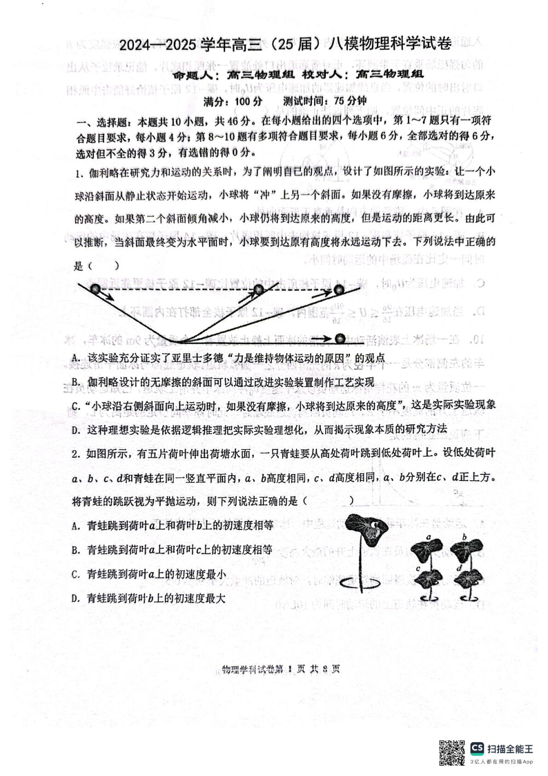 辽宁省鞍山市第一中学2025届高三下学期八模考试物理