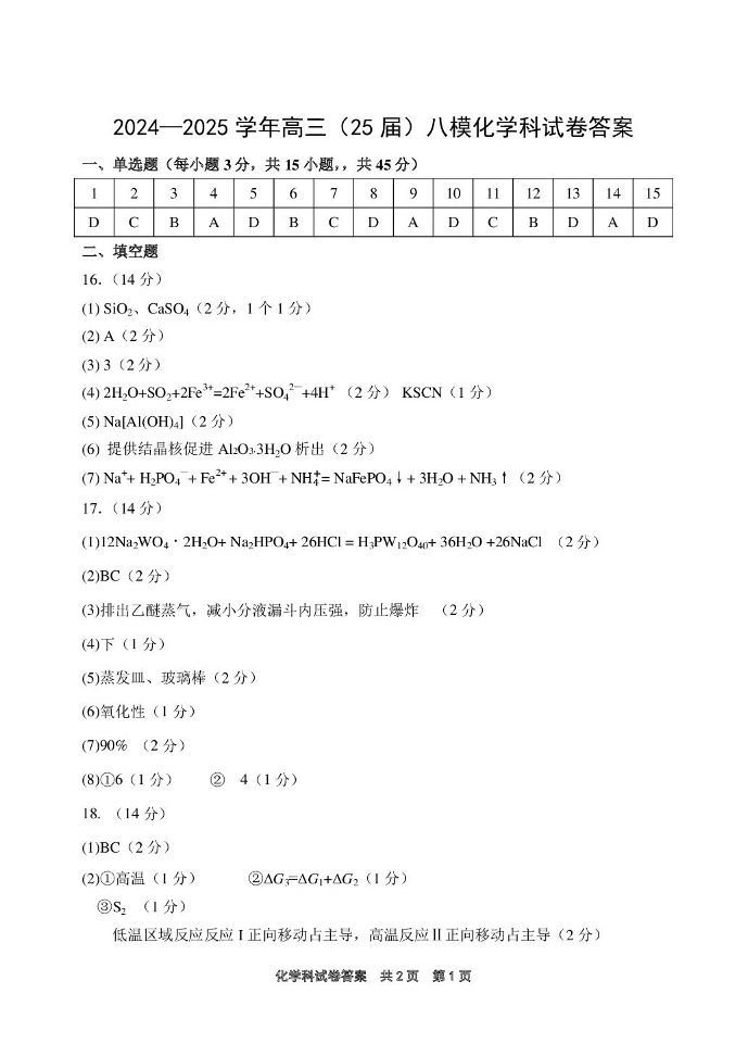 辽宁省鞍山市第一中学2025届高三下学期八模考试化学答案