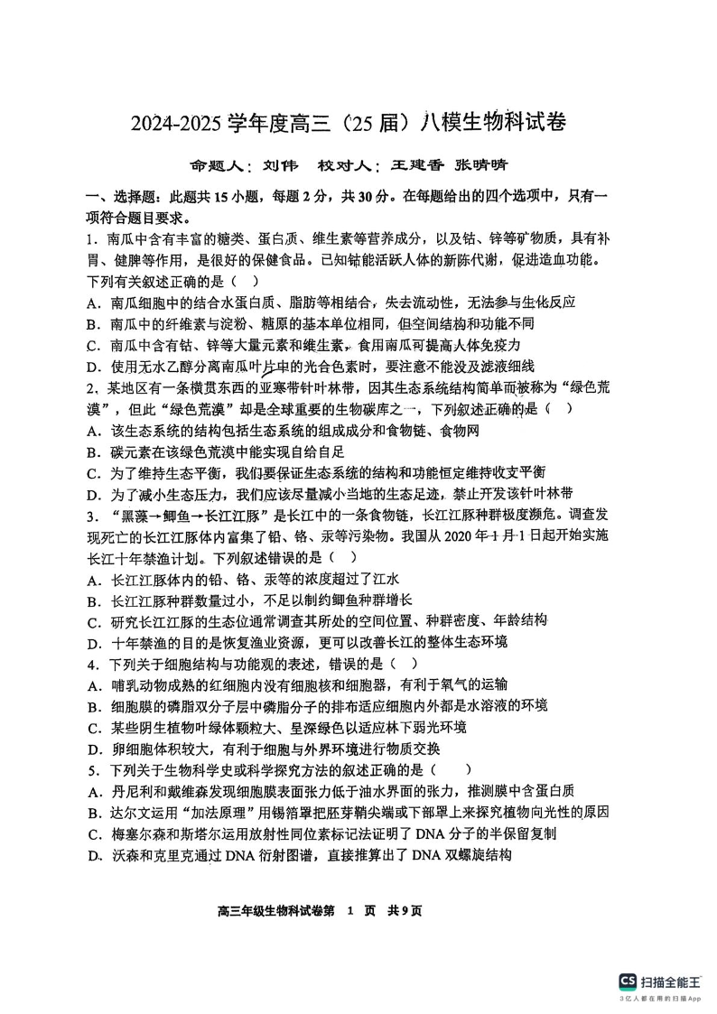 辽宁省鞍山市第一中学2025届高三下学期八模考试生物