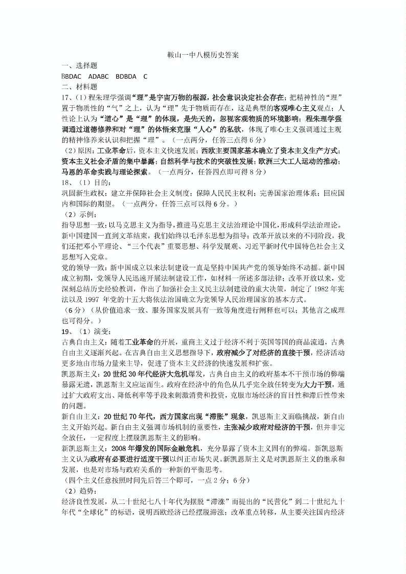 辽宁省鞍山市第一中学2025届高三下学期八模考试历史答案