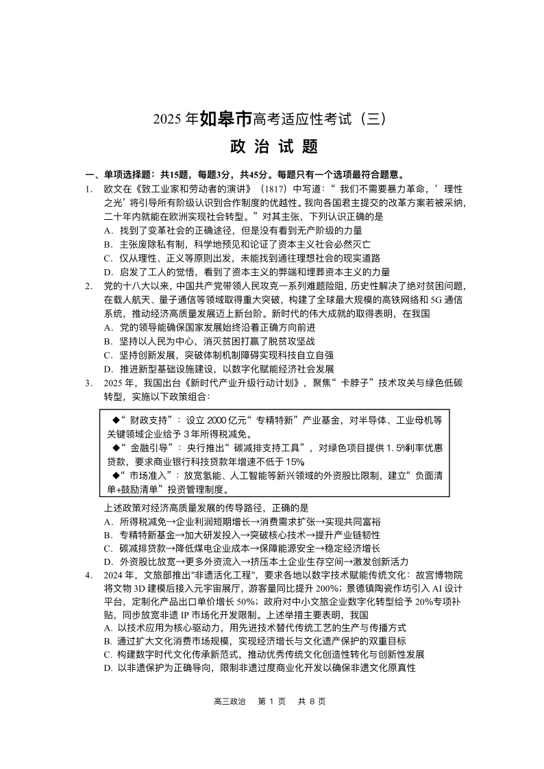 江苏省南通市如皋市2025届高三下学期高考适应性考试(三)政治+答案
