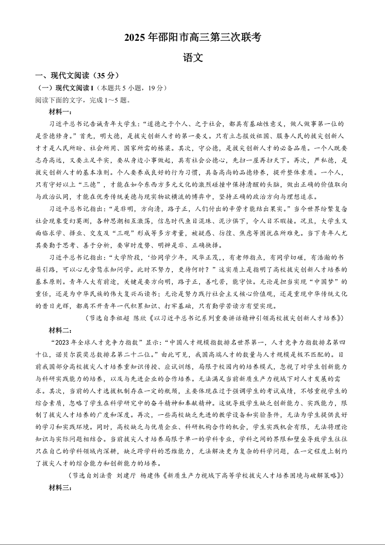 湖南省邵阳市2025届高三下学期第三次联考语文+答案