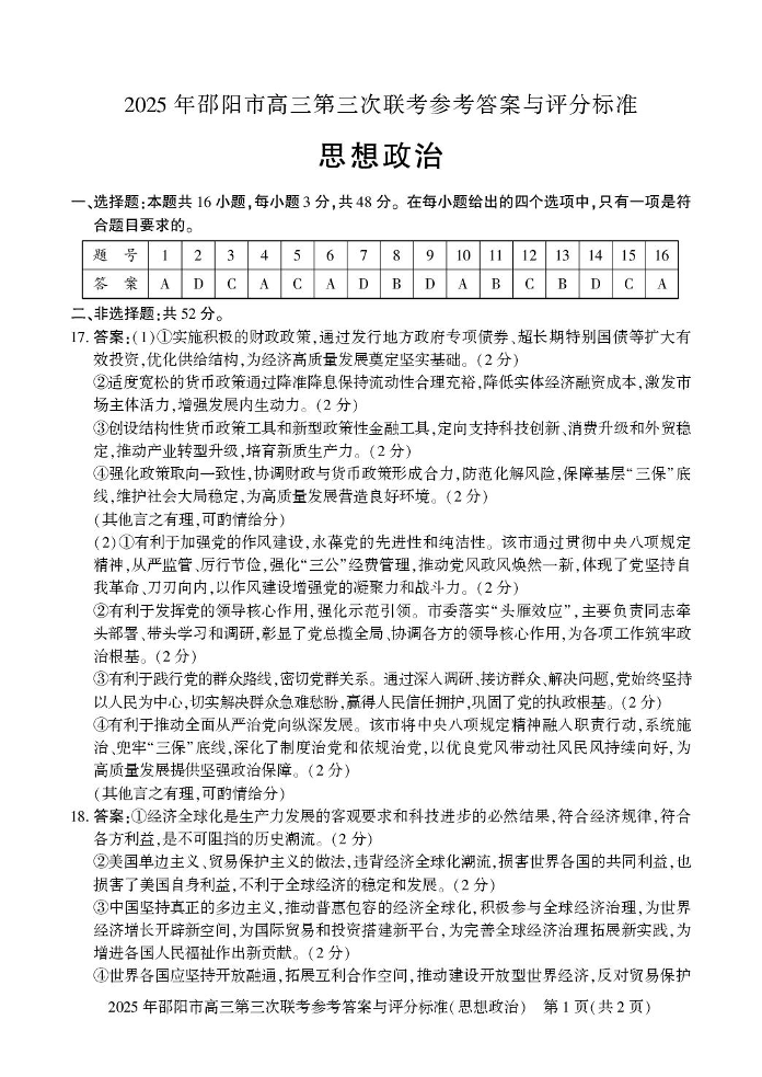 湖南省邵阳市2025届高三下学期第三次联考政治答案