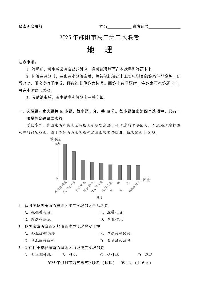 湖南省邵阳市2025届高三下学期第三次联考地理