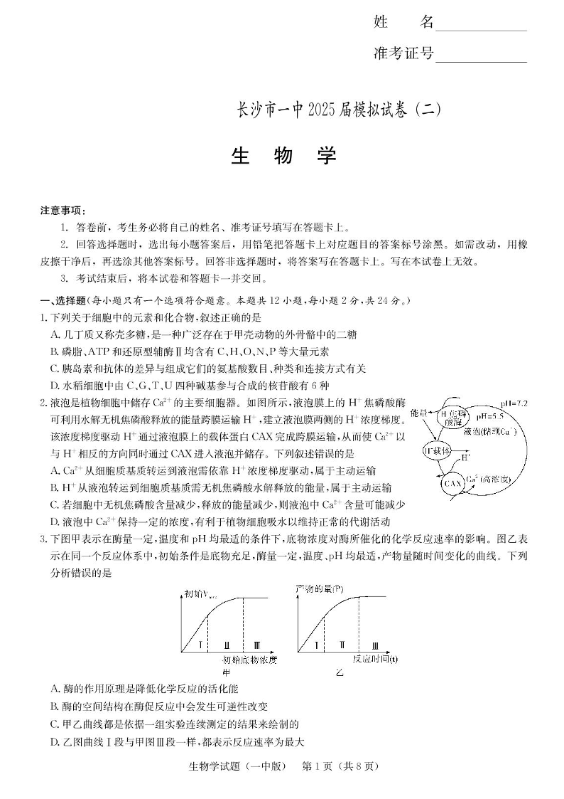湖南省长沙市一中2025届高三下学期模拟考试(二)生物+答案