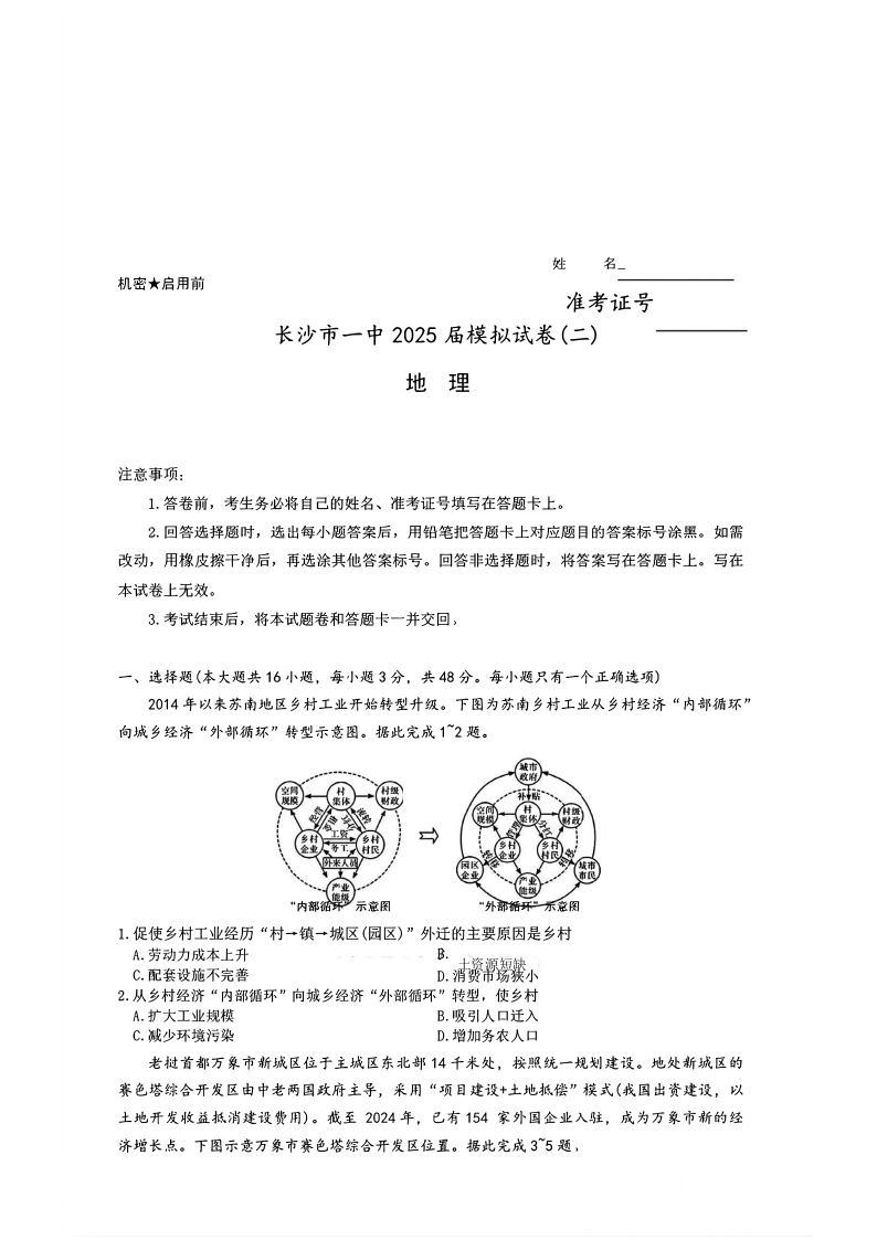 湖南省长沙市一中2025届高三下学期模拟考试(二)地理+答案