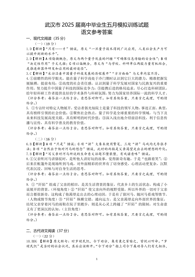 湖北省武汉市2025届高三五月模拟训练语文答案