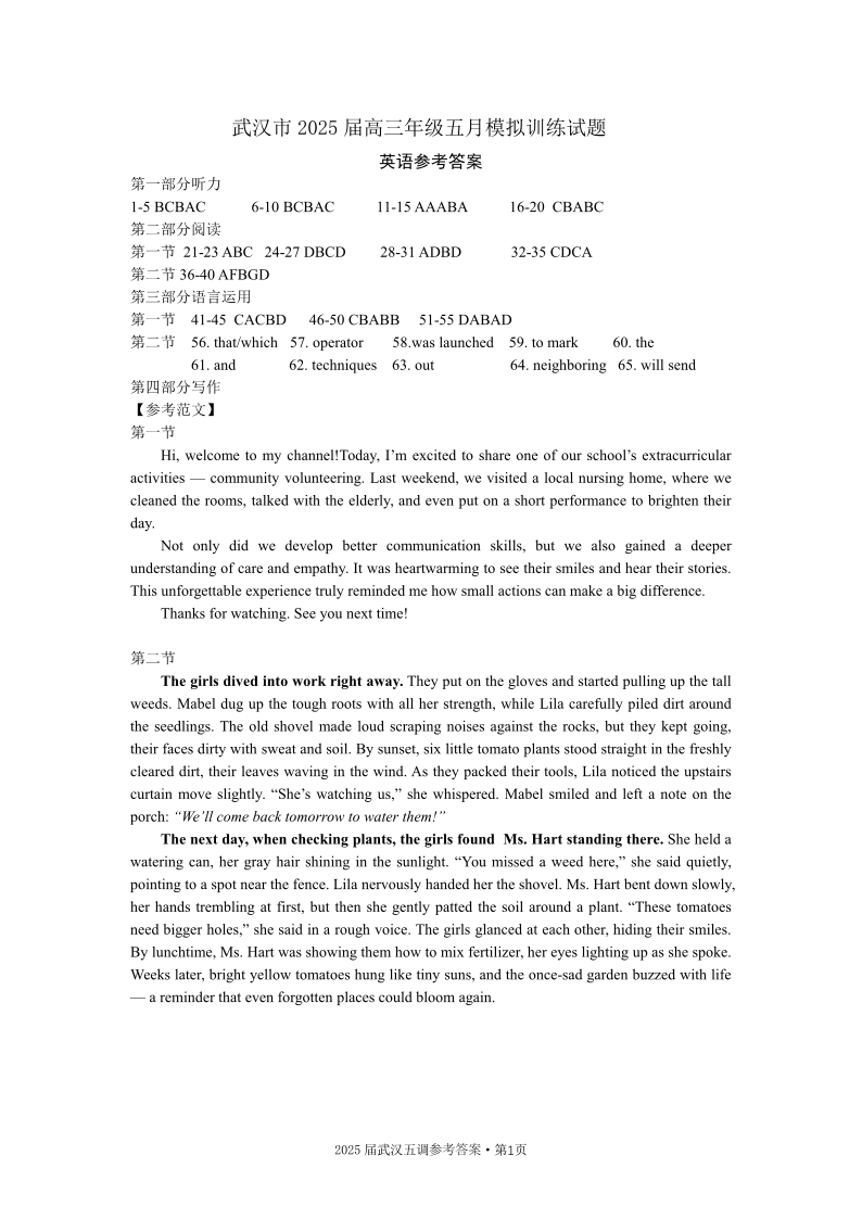 湖北省武汉市2025届高三五月模拟训练英语答案