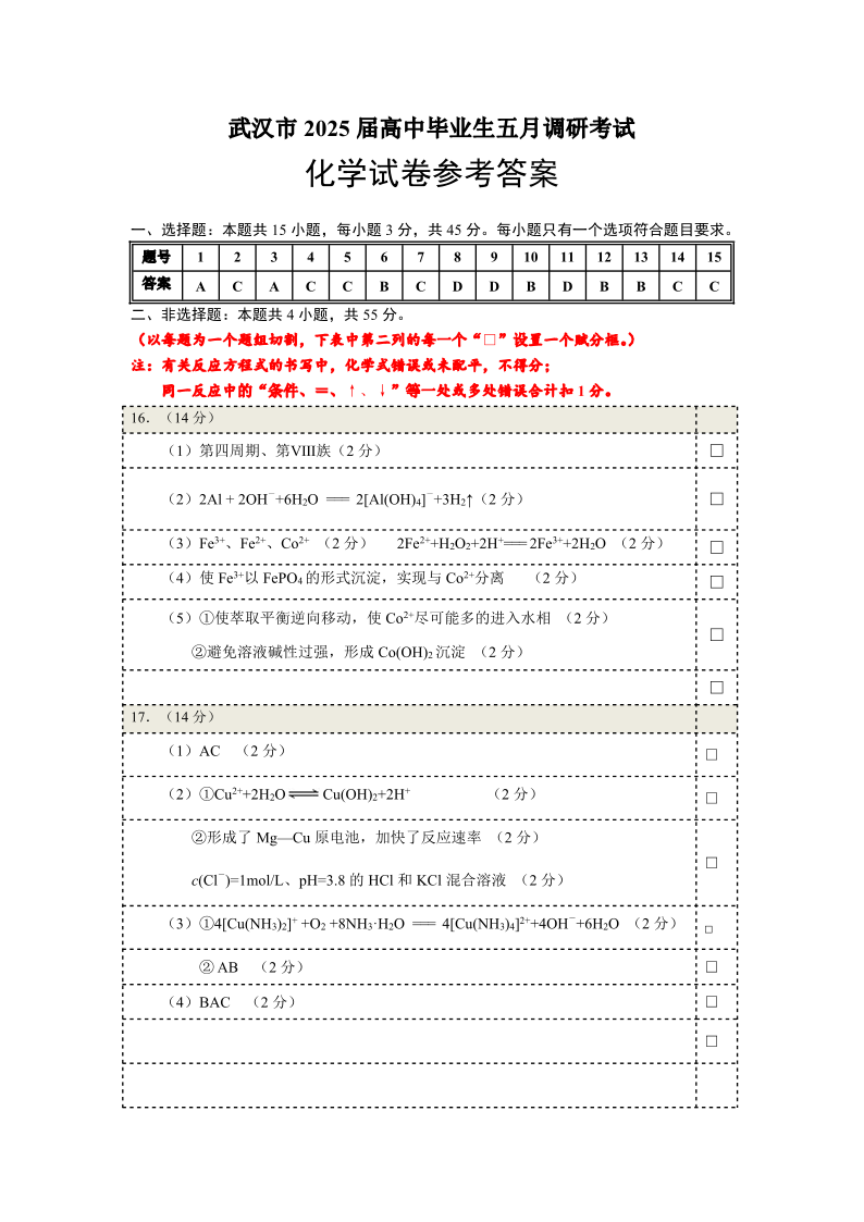 湖北省武汉市2025届高三五月模拟训练化学答案