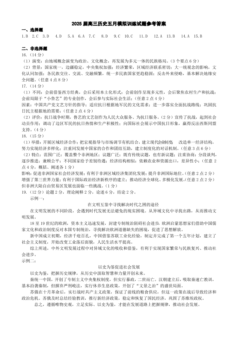 湖北省武汉市2025届高三五月模拟训练历史答案