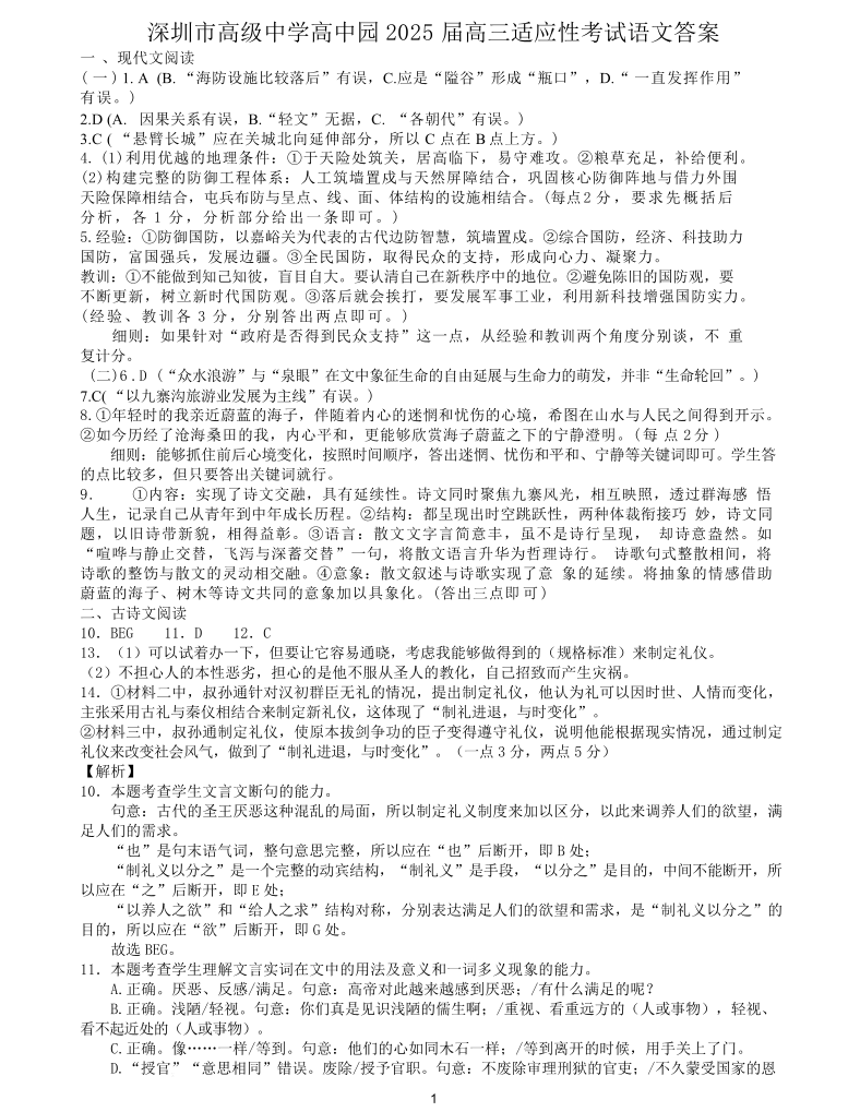广东省深圳市高级中学高中园2025届高三高考适应性考试语文答案