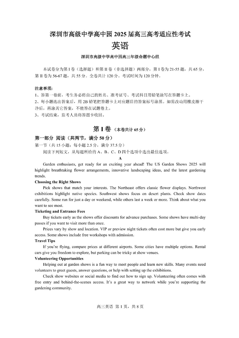 广东省深圳市高级中学高中园2025届高三高考适应性考试英语+答案
