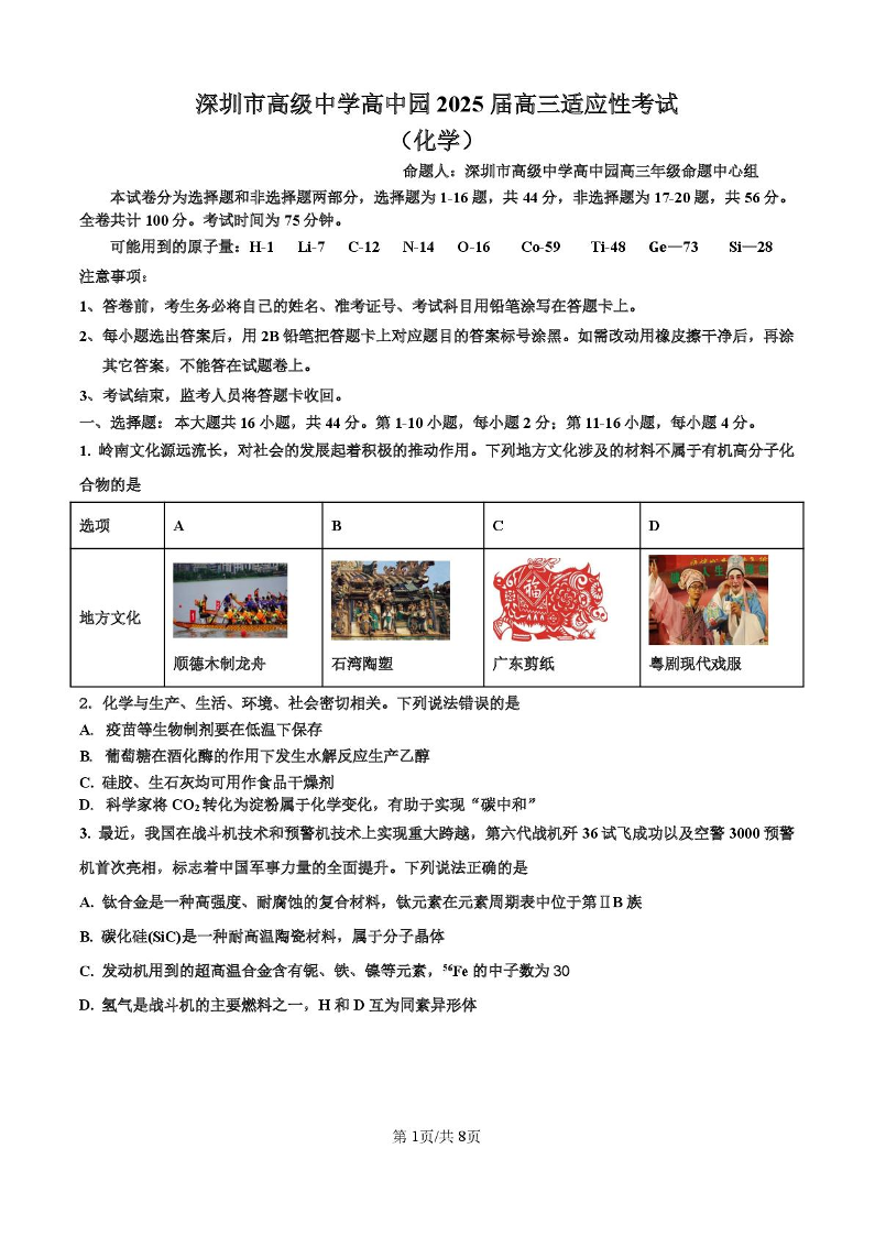 广东省深圳市高级中学高中园2025届高三高考适应性考试化学