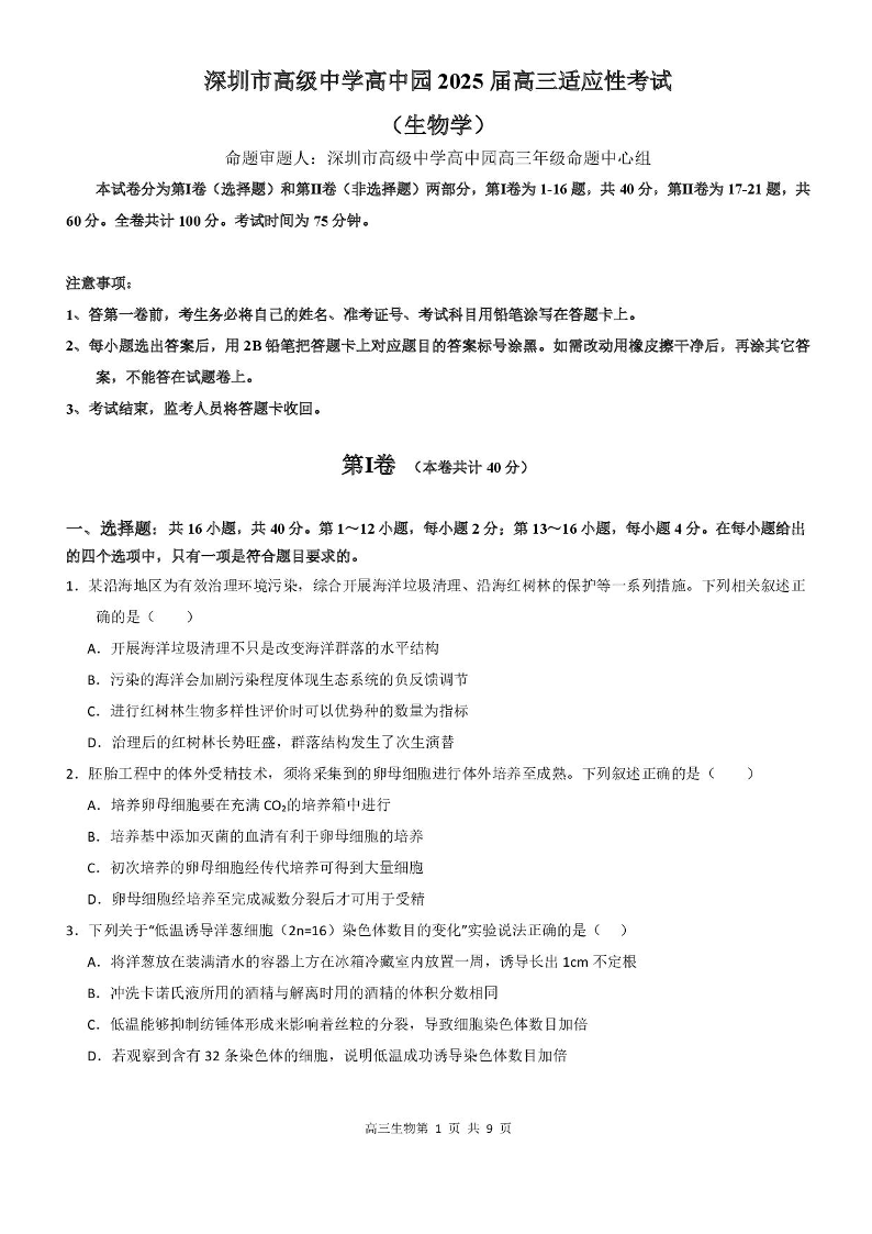 广东省深圳市高级中学高中园2025届高三高考适应性考试生物+答案