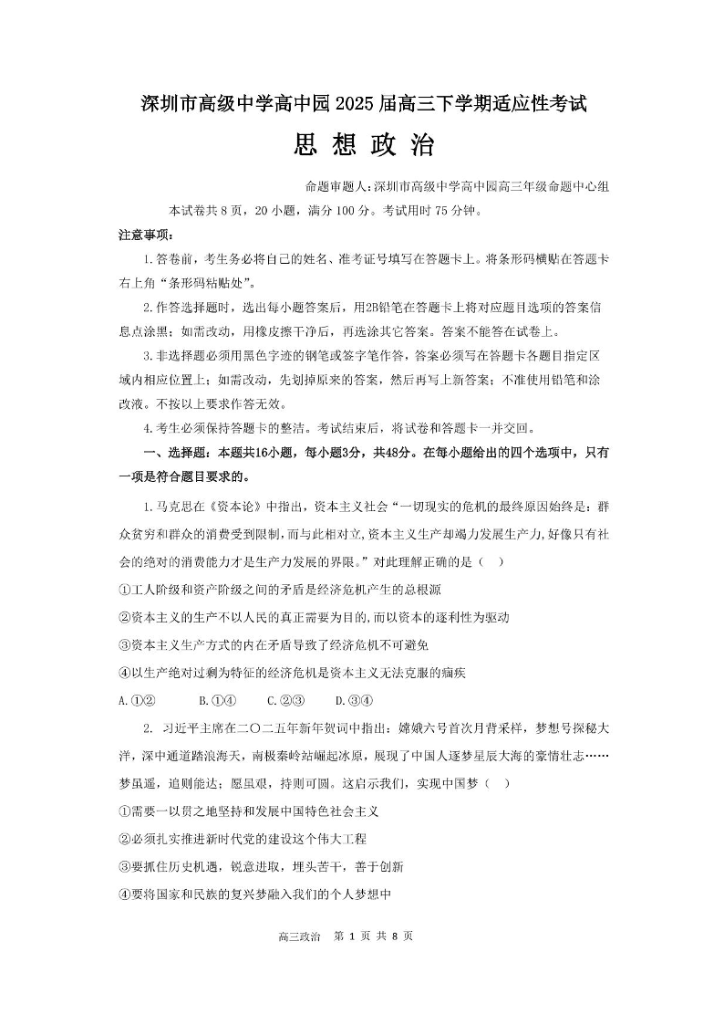 广东省深圳市高级中学高中园2025届高三高考适应性考试政治+答案